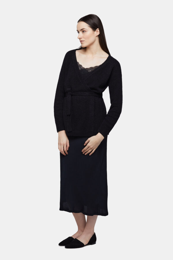 Pehme seotav kardigan tundub seljas kui soe embus. Selle naiselik siluett lisab igale kandjale trendikust ning elegantsi. Kandke kardigani kinniseotult lisakihina või üksinda, tuues esile kauni V-kaeluse. Riideese on ideaalne valik väljapeetud naisele, kes hindab naturaalseid kangaid ja ajatut disaini.